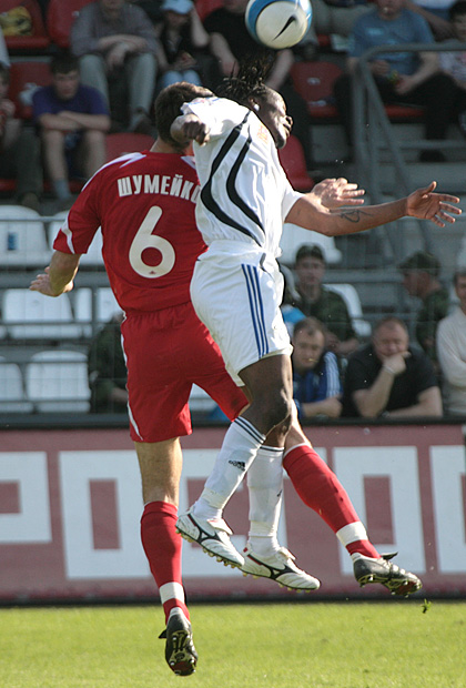 Баффур Гьян выигрывает мяч на втором этаже у Виталия Шумейко.