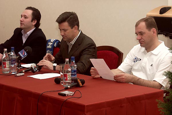 Слева направо: пресс-атташе «Сатурна» Михаил Пукшанский, генеральный директор клуба Михаил Воронцов и главный тренер команды Владимир Вайсс.